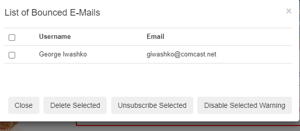 - Unsubscribe Selected - This will uncheck the E-Mail Blast Opt-In box on that user's profile, removing them from the e-mail blast list, a good choice if that user continually shows in alerts after multiple e-mail blasts, suggesting that the e-mail address may no longer be valid;